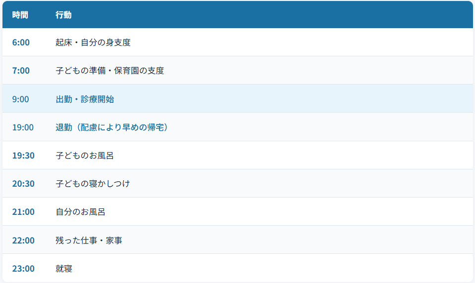 まず院長に勤務形態について相談したところ、育児との両立を前提に柔軟に対応していただける環境が整っていました。